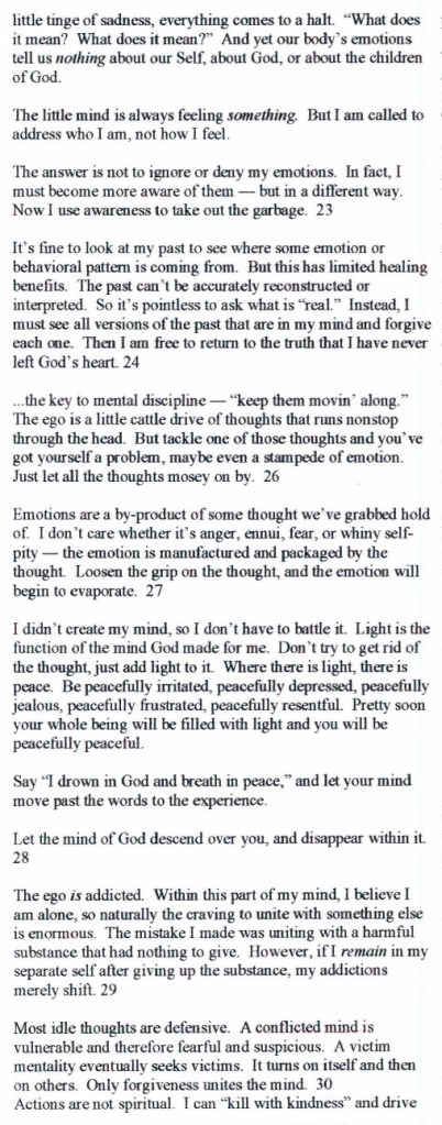 => I now made a conscious effort to regain my physiological balance quickly after an upset. Sometimes I have to express the negative feelings strongly in order to resolve them; I’ve learned that this can be a good thing….My goal is to return my body to its normal, healthier state as soon as possible. (196) [equanimity or Peace of God]
