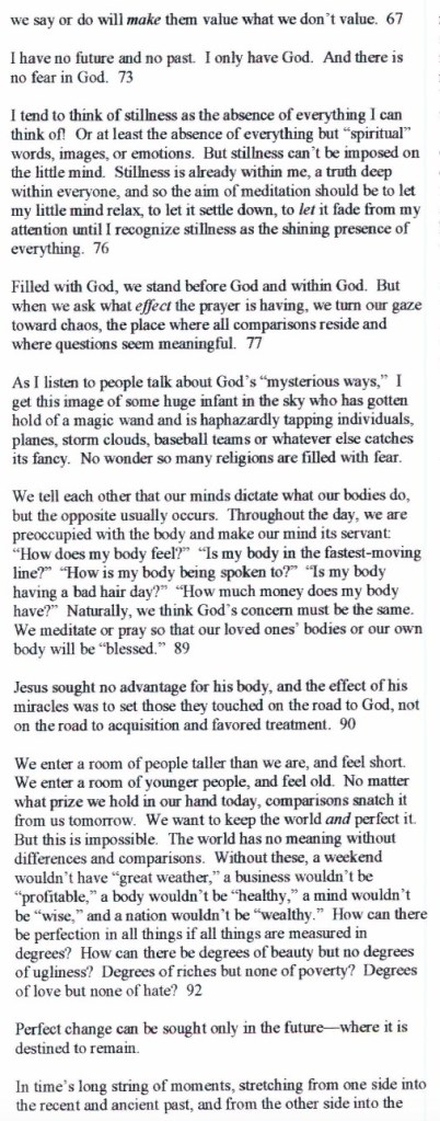 - “If you are “full up” you can use anything to see Mister God. If you’re full up, you don’t need the cross ‘cos the cross is inside you. If you’re not full up, you have the cross outside you and then you make it a magic thing. If you’re not full up inside you, then you can make anything a magic thing, and then it becomes an outside bit of you. If you do that, then you can’t do what Mister God wants you to do. Love everybody like you love yourself, and you’ve got to be full up with you to love yourself properly first. It’s the outside bits that make all the different churches and things like that. Mister God said ‘I am,’ and that’s what he wants us all to say — that’s the hard bit.” You don’t have to want things outside you to fill up the gaps inside you. You don’t leave bits of you hanging around on objects in shop windows, in catalogs or on advertising. Wherever you go you take your whole self with you; you don’t leave bits lying around to get stamped on; you’re all of a piece; you’re what Mister God wants you to be. An “I am,” like he is. All this time in church, Mister God’s been trying to turn an “It is” into an “I am.” (171).