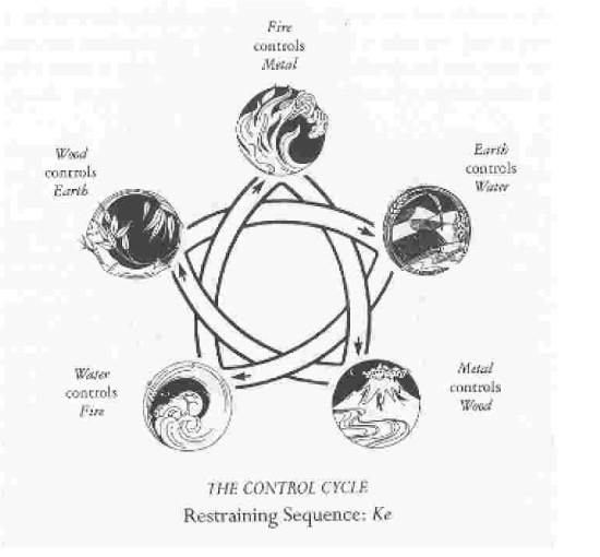 Just as the elements feed and sustain each other, so do they restrain and inhibit each other. Water controls Fire by quenching it. Fire restrains Metal by melting it, allowing it to be shaped and molded. Metal inhibits Wood by cutting it (symbolized by the ax chopping the tree). Wood restrains Earth by covering it, literally rooting it in place and preventing erosion. Earth controls Water by absorbing it and forming natural dams and riverbanks to prevent it from overflowing its channels.