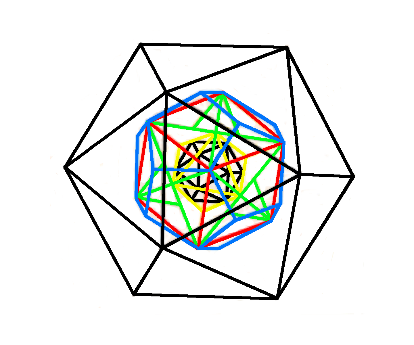 Prior to writing this paper, I had spent several years immersing myself in the 3-dimensional geometry and building models of the Lesser Maze — with a balsa wood frame, eyelet screws, Elmer’s Glue, and thread strung exhaustively between all the vertices.  Then I used Day-Glow paint to color the shape outlined by the intersecting strings — thus bringing to “life” the various shapes within when seen under black light.  The largest model icosahedron was just small enough to fit through a door — and included the inner icosahedron which I hand knotted with long tweezers.   That model became too difficult to continue to transport through my life and was ritually destroyed.  The other two, a dodecahedron and smaller Icosahedron without the Inner Icosahedron, are still intact.